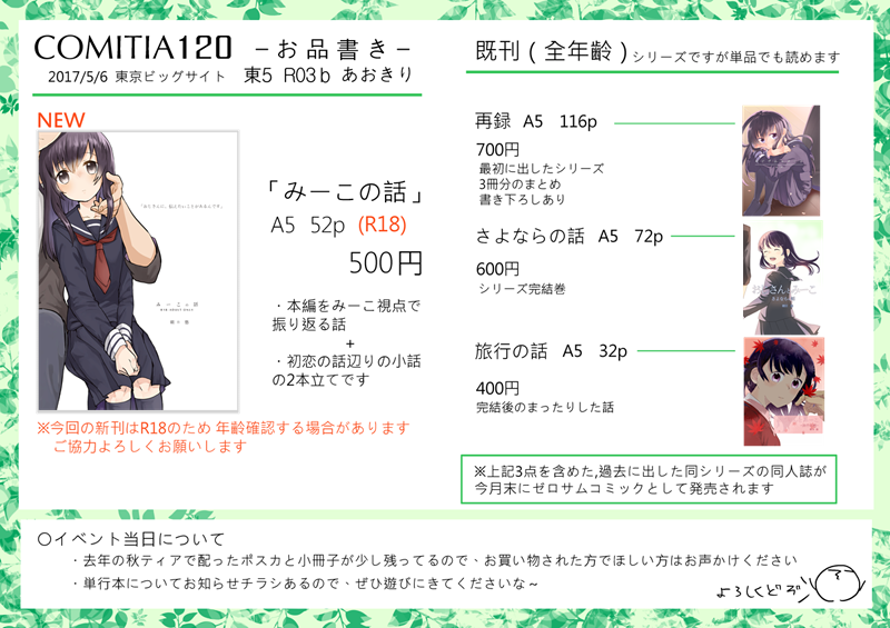 単行本化にともない、既刊分は同人誌での発行ができなくなります。楽しみにしてた方は、単行本の方を、どうぞよろしくー。